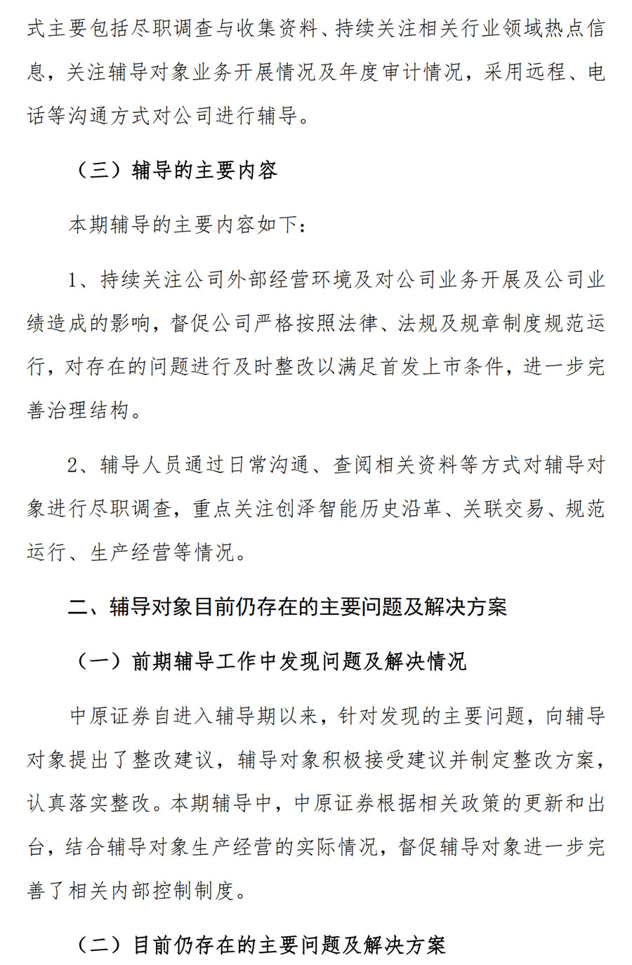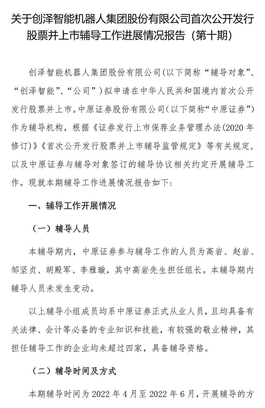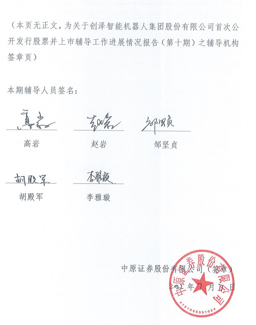 中原證券關于創(chuàng)澤智能機器人集團股份有限公司首次公開發(fā)行股票并上市輔導工作進展報告