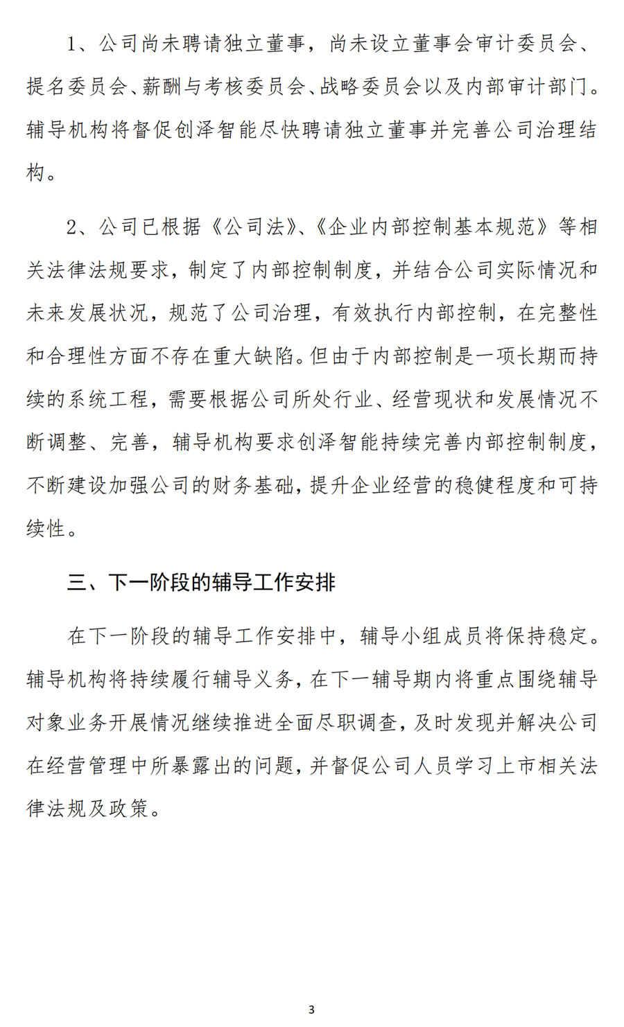 2、公司已根據(jù)《公司法》、《企業(yè)內部控制基本規(guī)范》等相關法律法規(guī)要求,制定了內部控制制度,并結合公司實際情況和未來發(fā)展狀況,規(guī)范了公司治理,有效執(zhí)行內部控制,在完整性和合理性方面不存在重大缺陷。但由于內部控制是一項長期而持續(xù)的系統(tǒng)工程,需要根據(jù)公司所處行業(yè)、經營現(xiàn)狀和發(fā)展情況不斷調整、完善,輔導機構要求創(chuàng)澤智能持續(xù)完善內部控制制度,不斷建設加強公司的財務基礎,提升企業(yè)經營的穩(wěn)健程度和可持續(xù)性。