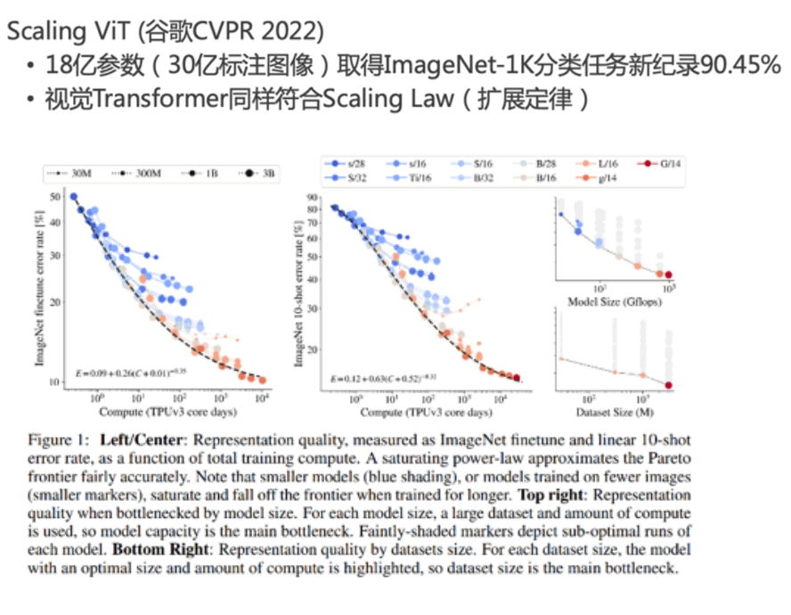 預(yù)訓(xùn)練大模型是過去幾年AI發(fā)展主旋律,但是主要集中于自然語言處理L域。視覺L域 在2021年開始迎來進(jìn)展。谷歌構(gòu)建了一個(gè)擴(kuò)展的ViT模型,擁有18億參數(shù),并使用30億的 標(biāo)注圖像進(jìn)行訓(xùn)練,在ImageNet上取得了新的記錄(90.45%)。這一工作還表明,在視覺L 域上,模型同樣符合Scaling Lawo即:模型越大、性能越好。