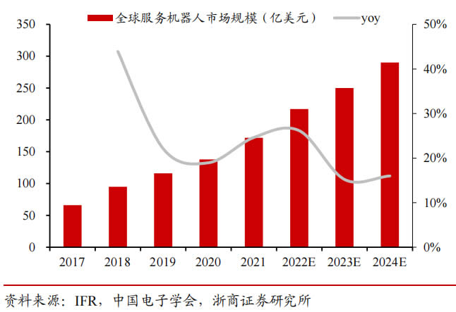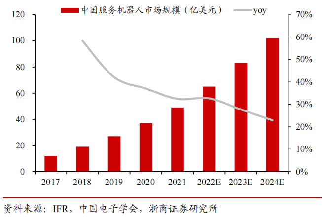 國(guó)內(nèi)看,2024 年我國(guó)服務(wù)機(jī)器人市場(chǎng)規(guī)模將達(dá) 102 億美元,2020-2024 年 CAGR 約 29%。