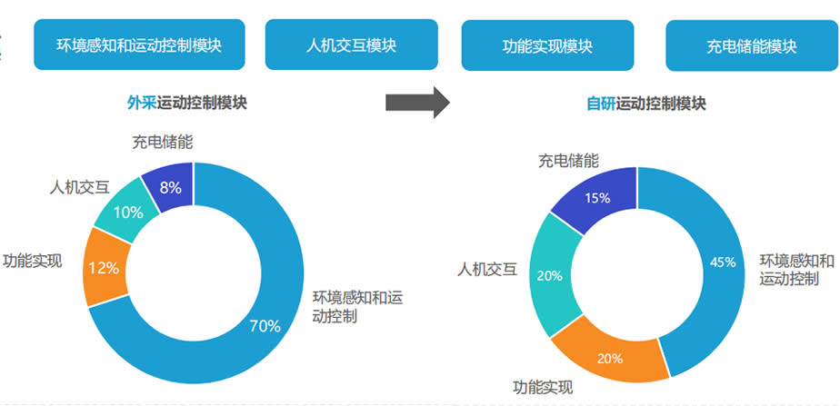 其中,人機交互模塊、功能實現(xiàn)模塊和充電儲能模塊基本實現(xiàn)自研。以往,環(huán)境感知和運動控制模塊會有部分企業(yè)選擇外采,但隨著技術(shù)的進步以及成本考慮,現(xiàn)在多數(shù)機器人企業(yè)也實現(xiàn)了環(huán)境感知和運動控制模塊的自研。
