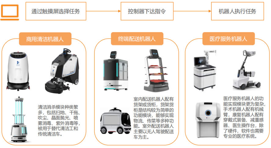 D一類:需要通過觸摸屏選擇任務(wù),控制系統(tǒng)下達指令才能執(zhí)行任務(wù),例如清潔機器人、終端配送機器人、醫(yī)療服務(wù)機器人;