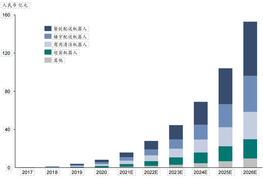 推進,中國商用服務(wù)機器人行業(yè)將迎來快速增長,預(yù)計2026年市場將超過150億元人民幣,其中餐飲配送機器人、商用清潔機器人、樓宇配送機器人為前三大