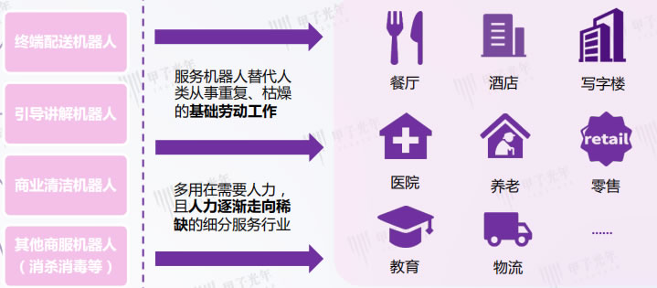 常見的商用場景中,商用服務(wù)機器人主要分為終端配送類機器人,商用清潔類機器人,引導講解類機器人等,被廣泛應(yīng)用在餐廳、酒店、娛樂、
