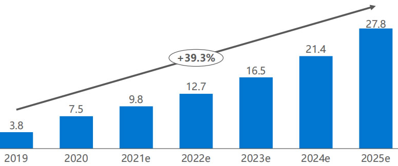 受新G疫情的防疫需求帶動(dòng),加之清潔行業(yè)長(zhǎng)期面臨招工難、人力成本G等 痛點(diǎn),商用清潔機(jī)器人的市場(chǎng)需求愈發(fā)旺盛。特別是具備智能消毒功能的清 潔機(jī)器人,通過(guò)集成消毒液自動(dòng)噴灑系統(tǒng),實(shí)現(xiàn)全域噴霧消殺,可以有效降 低人力工作強(qiáng)度和交叉感染風(fēng)險(xiǎn),已在地鐵站、機(jī)場(chǎng)、辦公區(qū)、展館、酒店 等場(chǎng)景加速落地應(yīng)用。在需求驅(qū)動(dòng)下,商用清潔機(jī)器人的市場(chǎng)規(guī)?焖僭鲩L(zhǎng)。 2019年中國(guó)商用清潔機(jī)器人的市場(chǎng)規(guī)模約3.8億元,預(yù)計(jì)2021年將達(dá)到9.8 億元,2025年將達(dá)到27.8億元,年復(fù)合增長(zhǎng)率約39.3%*。