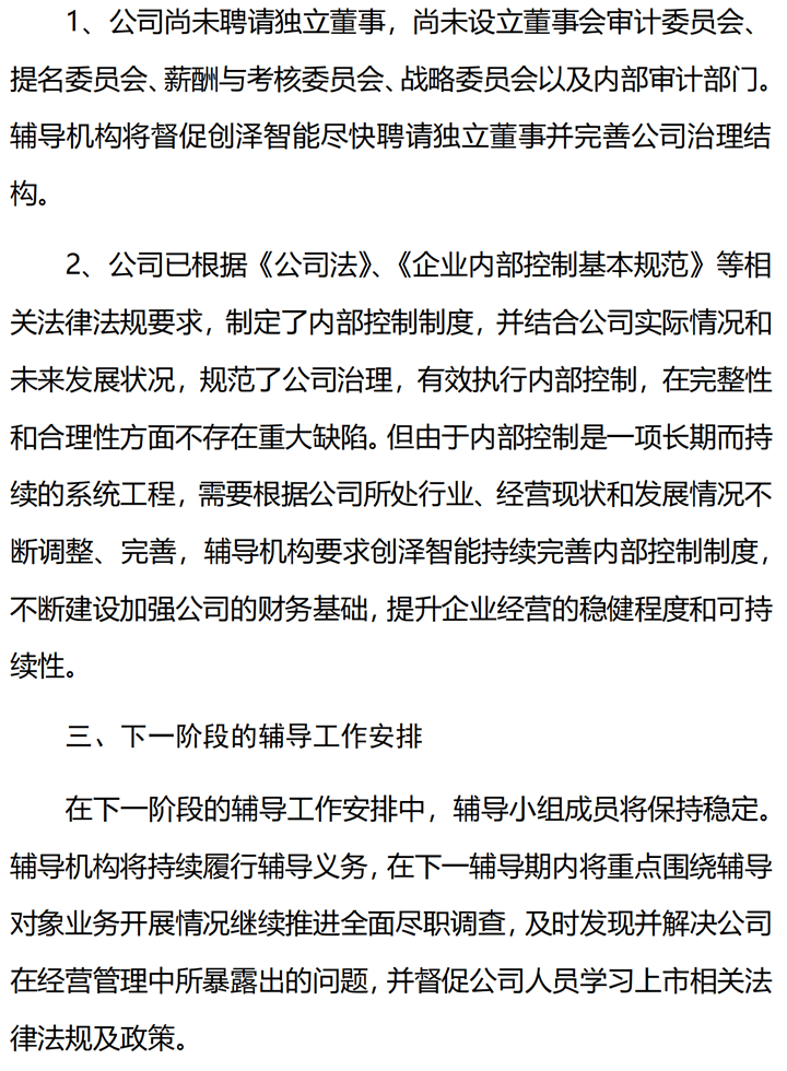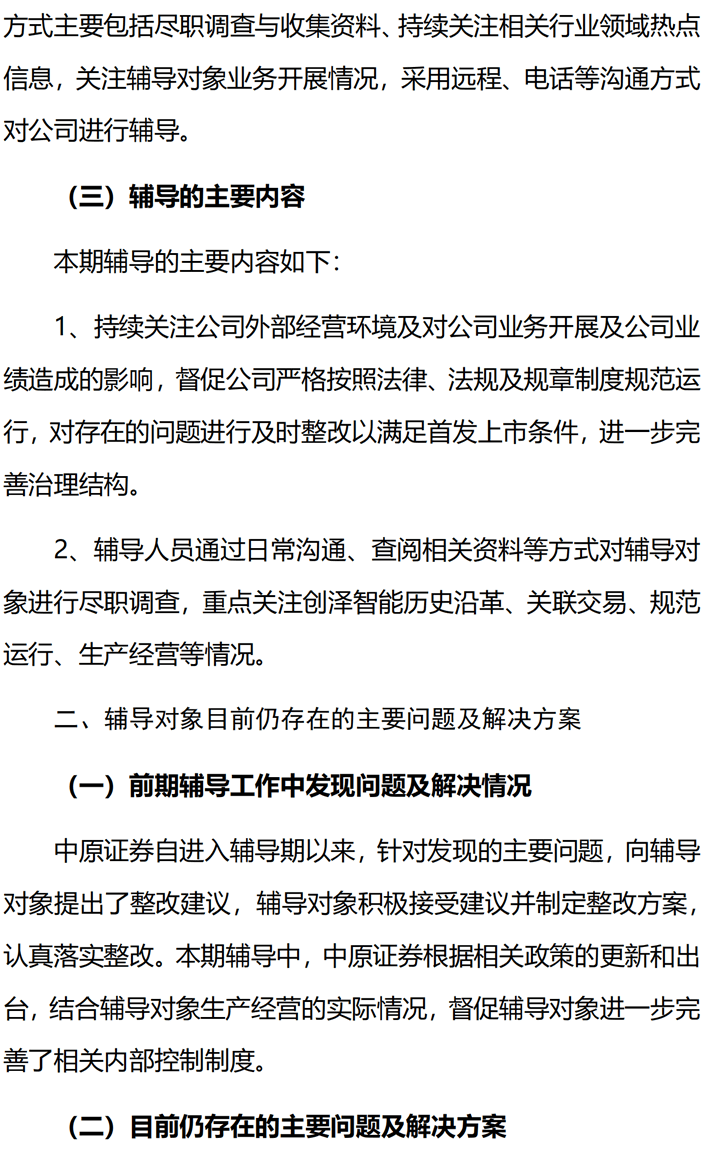 中原證券關(guān)于創(chuàng)澤機器人上市輔導內(nèi)容,對公司業(yè)務開展及公司業(yè)績造成的影響,督促公司嚴格按照法律,法規(guī)及規(guī)章制度規(guī)范運行,關(guān)注創(chuàng)澤智能歷史沿革生產(chǎn)經(jīng)營等情況