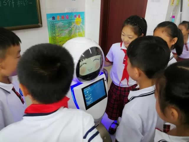 智能交互機(jī)器人正在課堂上與學(xué)生們互動(dòng)呢,這是課堂互動(dòng)現(xiàn)場(chǎng)...