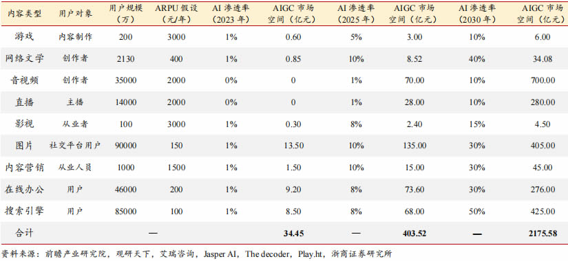 式,測算國內(nèi) 2023 年、2025 年和 2030 年 AIGC 市場空間。