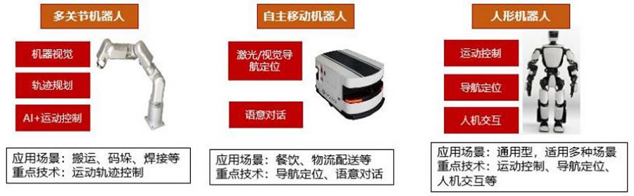 腳機(jī)器人: 指自主移動(dòng)機(jī)器人(AMR) ,所應(yīng)用到的激光/視覺SLAM導(dǎo)航和避障, 以及語音 對話等對AI算法依賴度較G,在倉儲(chǔ)物流、工業(yè)線邊和各類服務(wù)場景均有落地