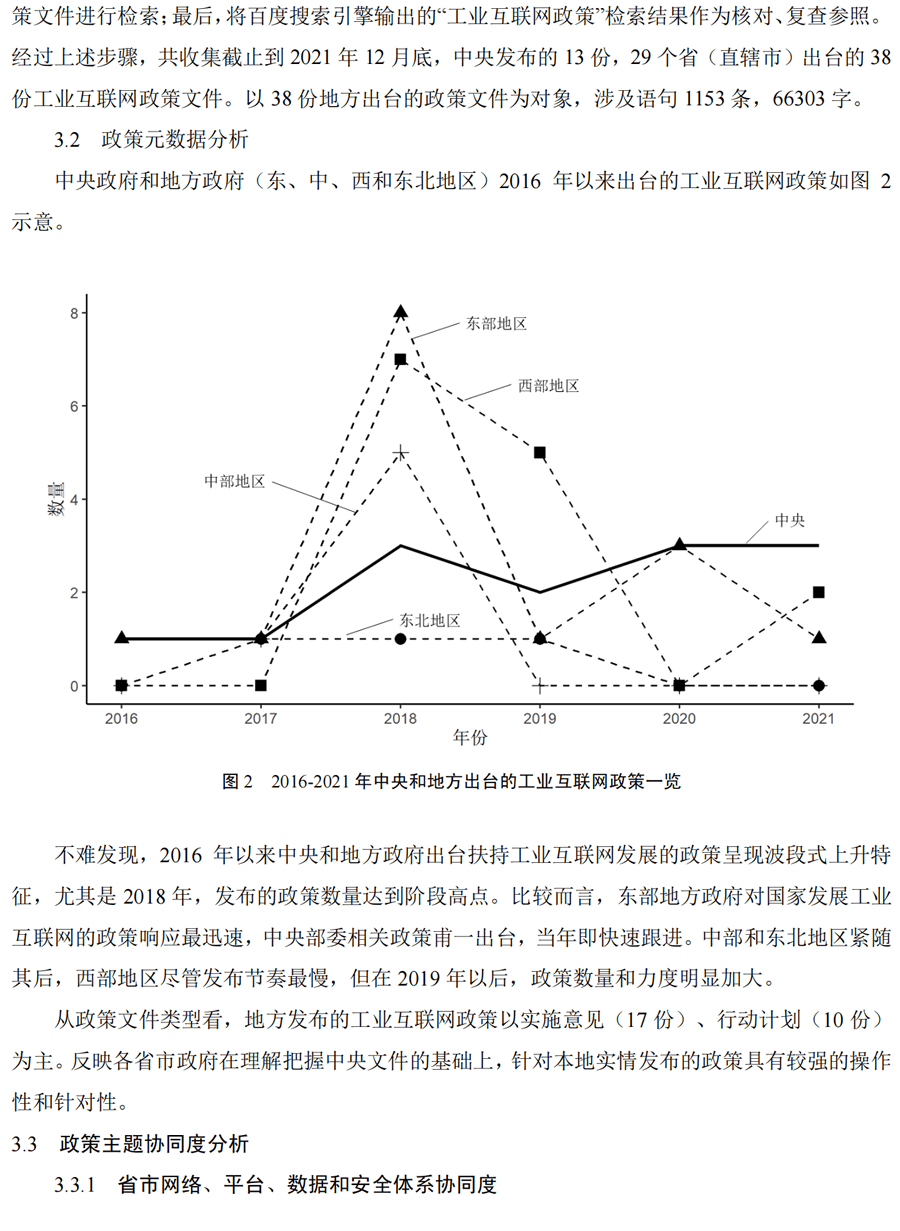 現(xiàn)有研究多圍繞工業(yè)互聯(lián)網(wǎng)架構(gòu)、標(biāo)準(zhǔn)和平臺(tái)體系展開,較少分析地方政府對(duì)四大功能體系 建設(shè)的政策導(dǎo)向。本文一方面應(yīng)用協(xié)同度算法評(píng)價(jià)地方政策體系協(xié)同水平,識(shí)別體系協(xié)同短板, 另一方面總結(jié)東、中、西和東北地區(qū)地方政策建設(shè)工業(yè)互聯(lián)網(wǎng)的側(cè)重點(diǎn)差異。