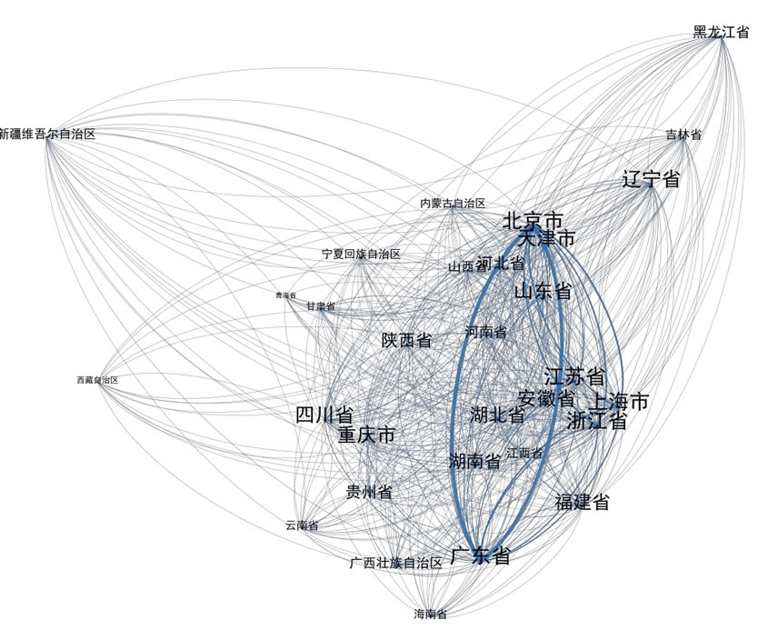 基于 2200 家我國人工智能骨干企業(yè)的技術(shù)合作關(guān)系,報(bào)告構(gòu)建了價(jià)值網(wǎng) 絡(luò)空間分布圖(如圖 16 )。從技術(shù)合作關(guān)系的密度看,北京市、廣東省和上海 市構(gòu)成了人工智能產(chǎn)業(yè)集群網(wǎng)絡(luò)結(jié)構(gòu)的三個(gè)“J點(diǎn)”。同時(shí),北京市、廣東省、 上海市、江蘇省、安微市、四川省、湖北省、湖南省、重慶市、山東省和福建 省之間存在密集的人工智能技術(shù)合作關(guān)系