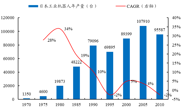 日本工業(yè)機器人年產(chǎn)量由 1970 年的 1350 臺猛增到 1980 年的 19843 臺,年均增長率為 30.8%,處于爆發(fā)性增長的 初級階段。