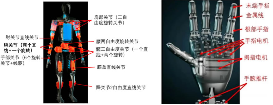 根據(jù) 2023 年特斯拉股東大會(huì)直播顯示,我們對(duì) 28 個(gè)執(zhí)行器位置和數(shù)量 進(jìn)行預(yù)計(jì),28 個(gè)執(zhí)行器分別為肩關(guān)節(jié)(單側(cè)三自由度旋轉(zhuǎn)關(guān)節(jié))6 個(gè),肘關(guān)節(jié)(單側(cè)直線(xiàn)關(guān)節(jié))2 個(gè),腕部關(guān)節(jié)(單側(cè) 2 個(gè)直線(xiàn)+1 個(gè)旋轉(zhuǎn))6 個(gè),腰部(二自由度旋轉(zhuǎn)關(guān)節(jié))2 個(gè),髖關(guān)節(jié)(單側(cè) 1 個(gè)直線(xiàn)+2 個(gè)旋轉(zhuǎn))6 個(gè),膝蓋(單側(cè) 1 直線(xiàn)關(guān)節(jié))2 個(gè),踝部(單側(cè)二自由度直線(xiàn)關(guān)節(jié))4 個(gè)。